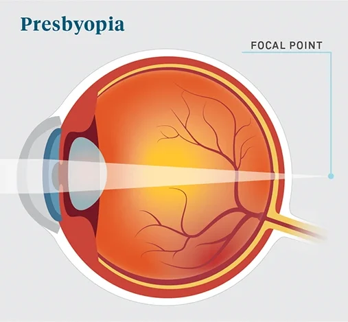 Presbyopia is a natural loss of the eye’s ability to focus on near objects. It happens as the lens inside the eye gradually becomes less flexible, making it harder to adjust focus between far and near.